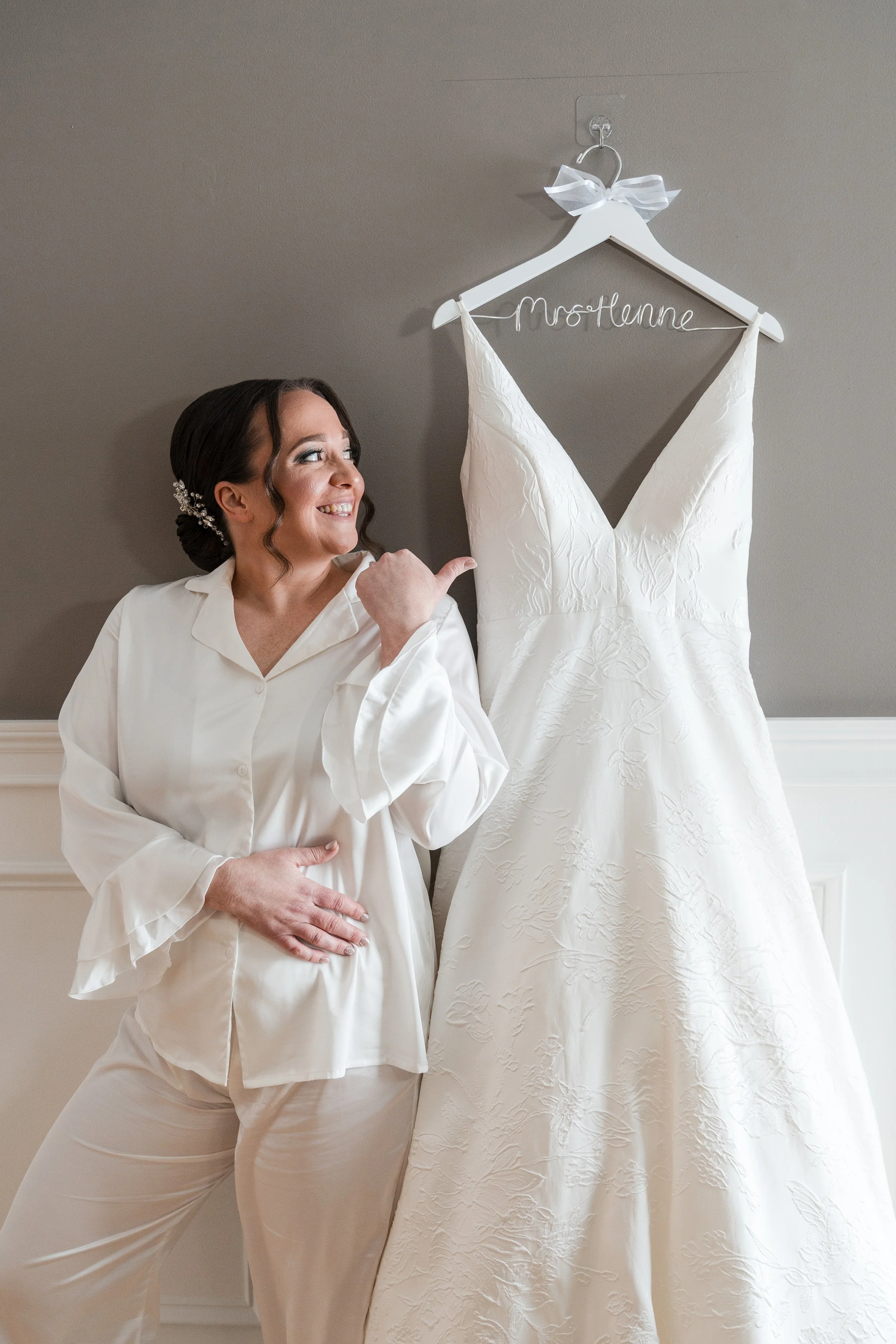 “Now the story of the day I found my dream dress. I came to NFBS with my sister and matron of honor and we were greeted with so many happy people and our own private corner that said on the screen “The Future Mrs. Henne”. The person who helped us was this cute woman! This made everything so real! I tried on probably 15 dresses that day and then my sister asks if we could try on a more clean look and I remember our girl saying, “I saw something in the sample sale selection and I don’t even know if you’re going to like it but, I want to pull it out”. I was super excited and when she brought the dress out, I can recall saying to my sister that I couldn’t wait to try that sample on. I tried both dresses on but I fell in love with the sample dress, so I went to go try it on for the second time and as I put the dress on in the dressing room and a song started to play on the speakers.. it was the song that my mother had danced with my brother at his wedding in 2017. Our mother had passed away in 2022 and it was very hard not having her here with me and at that moment, I started to get choked up and I could hear my sister too. I knew at this moment, this was my dress and this was a sign from my mom that she was here with me and I got to say yes to my dream dress!”